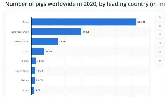 根據(jù)STATISTA數(shù)據(jù)公布統(tǒng)計(jì),截至2020年4月,中國(guó)擁有3.1億頭生豬,歐盟有1.48億頭美國(guó)有0.78億頭,占據(jù)世界前三位。目前全球生豬總量約為6.67億頭豬,相比2019年同期的7.76億頭下降了約1.1億頭。